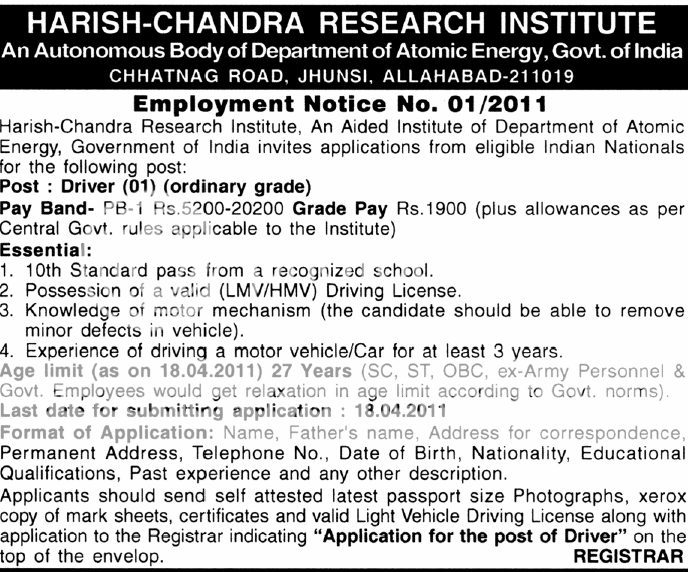 Complete application in all respect along with necessary document must be reach at Registrar, Harish-Chandra research Institute, Chhatnag Road, Jhunsi, Allahabad - 211 019 on or before 18/04/2011. Envelope must be superscribe Application for the post of Driver".More details View Official Notification: view